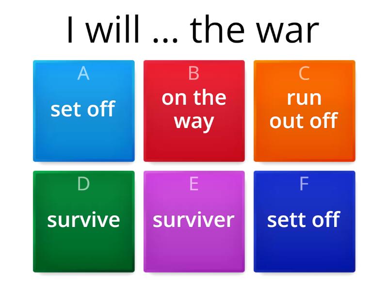 1) I will ... the war a) set off b) on the way c) run out off d) survive e) surviver f) sett off 2) that child is very ... because he never stops still a) energetic b) cofused c) upset d) annoyed e) miserable f) thrilled 3) choose the correct a) entuhsiastic b) enhtusiastic c) enthusiastic d) entusiastic e) enthusiasttic f) enthussiastic 4) choose the correct a) we explred the jungle b) we exploring the jungle c) wer explore the jungle d) we explored the jungled e) was explor the jungle f) we explors the jungle 5) my mother is ... by the math grade a) upsed b) upsett c) antisocial d) miserable e) upset f) annoyed 6) we took a ... together as a family for Christmas a) on the way b) run out off c) run out of d) journey e) confused f) set off 7) My brother is a ... don't leave me money a) irritable b) upset c) delighted d) thrilled e) cheerful f) miserable 8) I'm ... because tomorrow is my birthday a) set off b) thrilled c) explore d) annoyed  e) irritable f) confused 9) I have to ... this hole area a) feel lonely b) set off c) explore d) ecsplore e) shocked  f) confused 10) choose the correct a) cheeful b) cherful c) xeerful d) cheerfull e) cheerful f) cerful 11) I'm going to go ... today I need a bow a) canoeing b) compose song c) making pottery d) archery e) rock climbing f) direct a film 12) choose the correct a) dirct a film b) direct a flim c) diret a film d) direct a fim e) drect a film f) direct a fiilm 13) choose the correct a) aper on television b) apper on television c) apeear on television d) apear on teleevision e) appear on telebision f) appear on television 14) choose the correct a) wuindusrfing b) windsurfing c) winddsurfing d) windsurffing e) wiindurfing f) wind surfing 15) choose the correct a) cannoening b) canoening c) canoing d) canoeing e) cannoeing f) cannoing 16) choose the correct a) campping b) cammping c) camping d) canping e) campiing f) campingg 17) choose the correct a) orientering b) orieentering c) orienttering d) orienteering e) oriientenring f) orienterinng 18) choose the correct a) act in a play b) actt in a play c) act in a playing d) act on a play e) act a play f) act in play 19) choose the correct a) donatte money b) donate money c) donate mooney d) donate monney e) donnate money f) donate monei 20) choose the correct a) backpakc b) bacpac c) bacpak d) bakpak e) backpack f) backpac 21) choose the correct a) passport b) pasport c) paasport d) passaport e) pasaport f) pasapport 22) choose the correct a) tennt b) tent c) teent d) tend e) tenting f) tented 23) choose the correct a) lugage alowoance b) luggagge allowance c) luggage alowance d) luggage allowance e) lugag allowace f) luggage alowan 24) choose the correct a) guidebok b) guidebook c) gidebok d) guideebook e) gidebook f) guidebokk 25) choose the correct a) sunscream b) sumscreen c) sunscren d) sunscreen e) sunscreem f) sunsscreen 26) choose the correct a) sungglasses b) sunglasses c) sungglases d) sunglasess e) sunglases f) songglasses 27) choose the correct a) toiletries b) toilotres c) toiiletries d) toilletries e) toiletriess f) toileetries 28) choose the correct a) suuitcase b) suitcaase c) suitcase d) suiitcase e) suittcase f) suitcas 29) choose the correct a) take a toor b) take a tur c) take tour d) take a tour e) take on tour f) take in a tour 30) choose the correct a) hir a car b) hiir a car c) hire in a car d) hire in car e) hire a car f) hire on car