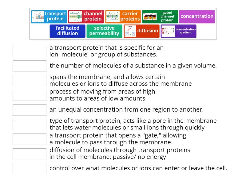 diffusion - process of moving from areas of high amounts to areas of low amounts, selective permeability - control over what molecules or ions can enter or leave the cell., concentration - the number of molecules of a substance in a given volume., concentration gradient - an unequal concentration from one region to another., facilitated diffusion - diffusion of molecules through transport proteins in the cell membrane; passive/ no energy, transport protein - spans the membrane, and allows certain molecules or ions to diffuse across the membrane, channel protein - type of transport protein, acts like a pore in the membrane that lets water molecules or small ions through quickly, gated channel protein - a transport protein that opens a "gate," allowing a molecule to pass through the membrane., carrier proteins - a transport protein that is specific for an ion, molecule, or group of substances.,