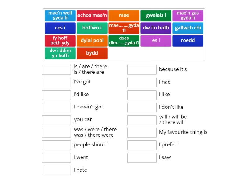fy hoff beth ydy - My favourite thing is, dw i'n hoffi - I like, dw i ddim yn hoffi - I don't like, mae'n gas gyda fi - I hate, mae'n well gyda fi - I prefer, es i - I went, ces i - I had, gwelais i - I saw, mae - is / are / there is / there are, roedd - was / were / there was / there were, bydd - will / will be / there will, hoffwn i - I'd like, achos mae'n - because it's, gallwch chi - you can, mae........gyda fi - I've got, does dim.......gyda fi - I haven't got, dylai pobl - people should,