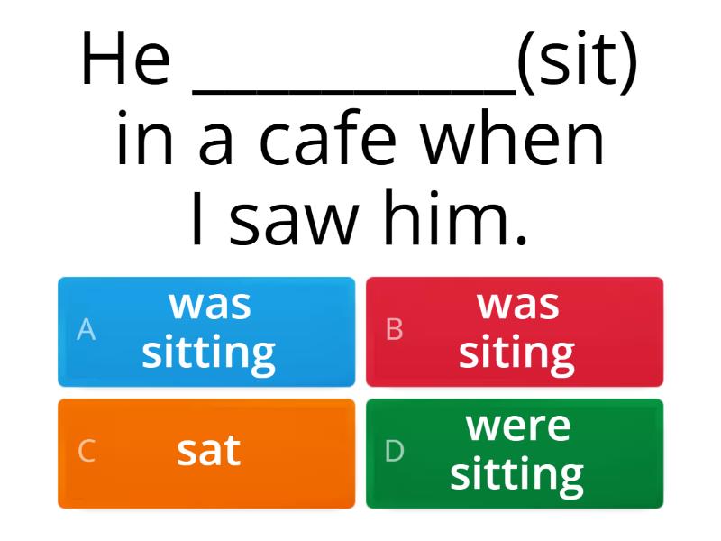1) He __________(sit) in a cafe when I saw him. a) was sitting b) was siting c) sat d) were sitting 2) When I _________(go out) , the sun was shining. a) goed out b) gone out c) was going out d) went out 3) The boy _________ (run) when he fell down. a) ran b) was running c) were running d) was runing 4) The light went out when I ________ (have) tea. a) had b) was haveing c) was having d) haved e) were having 5) My friends ______ when I came into the room. a) sanged b) was singing c) singing d) were singing e) sung 6) You  _________(play) the piano when I made dinner. a) plaing b) were plaing c) was playing d) were playing e) played 7) He __________(eat) his dinner when I went to visit him. a) ate b) eaten c) eating d) were eating e) was eating 8) She _________(study) at school when it started to rain. a) study b) was studing c) was studying d) studying e) were studying 9) When the phone rang, I ______ (have) a bath. a) had b) was having c) have d) was haveing e) were having