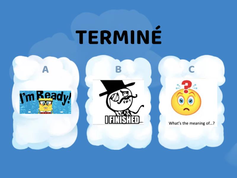 1) TERMINÉ a) b) c) 2) Tengo una pregunta a) b) c) 3) Qué significa...? a) b) c) 4) Estoy listo / lista! a) b) c) 5) ¿Puede repetir por favor? a) b) c) 6) ¿Puedo ir al baño por favor? a) b) c) 7) No entiendo. a) b) I don't understand. c) 8) Siento llegar tarde. a) b) c) 9) ¿Cómo se dice ... en inglés? a) b) c)