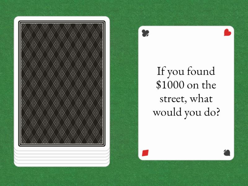 If you found $1000 on the street, what would you do? , What would you do if you knew there would be a new pandemic lockdown? , If you could go anywhere in the world for free, where would you travel? , How would the world be different if everyone in the world all spoke the same language? , What could happen if we all got superpowers? What power would you have? , What laws would you abolish if you could?, If you had to lose one of your five senses, which one could you live without? .