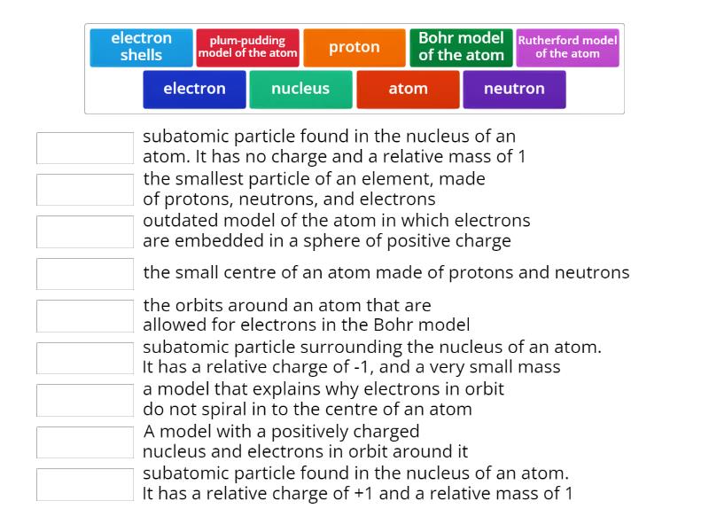 atom - the smallest particle of an element, made of protons, neutrons, and electrons, Bohr model of the atom - a model that explains why electrons in orbit do not spiral in to the centre of an atom, electron - subatomic particle surrounding the nucleus of an atom. It has a relative charge of -1, and a very small mass, electron shells - the orbits around an atom that are allowed for electrons in the Bohr model, neutron - subatomic particle found in the nucleus of an atom. It has no charge and a relative mass of 1, nucleus - the small centre of an atom made of protons and neutrons, plum-pudding model of the atom - outdated model of the atom in which electrons are embedded in a sphere of positive charge, proton - subatomic particle found in the nucleus of an atom. It has a relative charge of +1 and a relative mass of 1, Rutherford model of the atom - A model with a positively charged nucleus and electrons in orbit around it,
