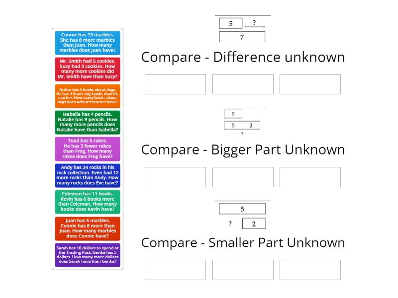 Compare - Difference unknown: Mr. Smith had 5 cookies. Suzy had 3 cookies. How many more cookies did Mr. Smith have than Suzy?, Sarah has 10 dollars to spend at the Trading Post. Gerika has 5 dollars. How many more dollars does Sarah have than Gerika? , Isabella has 4 pencils. Natalie has 9 pencils. How many more pencils does Natalie have than Isabella?, Compare - Bigger Part Unknown: Coleman has 11 books. Kevin has 6 books more than Coleman. How many books does Kevin have?, Andy has 34 rocks in his rock collection. Even had 12 more rocks than Andy. How many rocks does Eve have?, Juan has 5 marbles. Connie has 8 more than Juan. How many marbles does Connie have?, Compare - Smaller Part Unknown: Connie has 13 marbles. She has 8 more marbles than Juan. How many marbles does Juan have?, Arthur has 5 books about dogs. He has 4 fewer dog books than his teacher. How many books about dogs does Arthur’s teacher have?, Toad has 5 rakes. He has 3 fewer rakes than Frog. How many rakes does Frog have?,