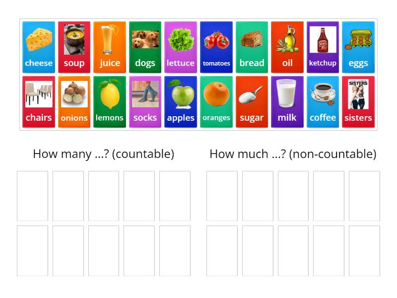 How many ...? (countable): lemons, eggs, tomatoes, apples, oranges, socks, onions, dogs, sisters, chairs, How much ...? (non-countable): soup, cheese, coffee, oil, juice, lettuce, milk, sugar, bread, ketchup,