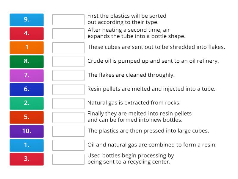 1. - Crude oil is pumped up and sent to an oil refinery., 1 - Natural gas is extracted from rocks., 2. - Oil and natural gas are combined to form a resin., 3.  - Resin pellets are melted and injected into a tube., 4.  - After heating a second time, air expands the tube into a bottle shape., 5.  - Used bottles begin processing by being sent to a recycling center., 6.  - First the plastics will be sorted out according to their type., 7.  - The plastics are then pressed into large cubes., 8.  - These cubes are sent out to be shredded into flakes., 9. - The flakes are cleaned throughly., 10.  - Finally they are melted into resin pellets and can be formed into new bottles.,