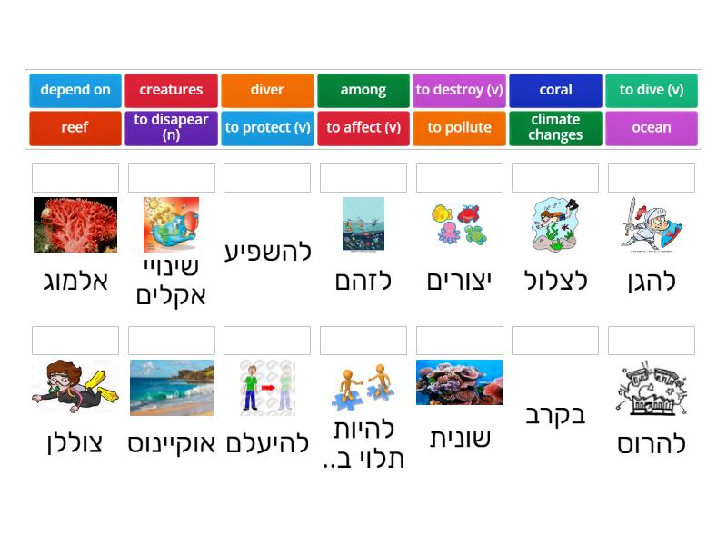 to disapear (n) - להיעלם, coral - אלמוג, reef - שונית, ocean - אוקיינוס, to dive (v) - לצלול, diver - צוללן, creatures - יצורים, among - בקרב, to protect (v) - להגן, to pollute - לזהם, climate changes - שינויי אקלים, to affect (v) - להשפיע, to destroy (v) - להרוס, depend on - להיות תלוי ב..,