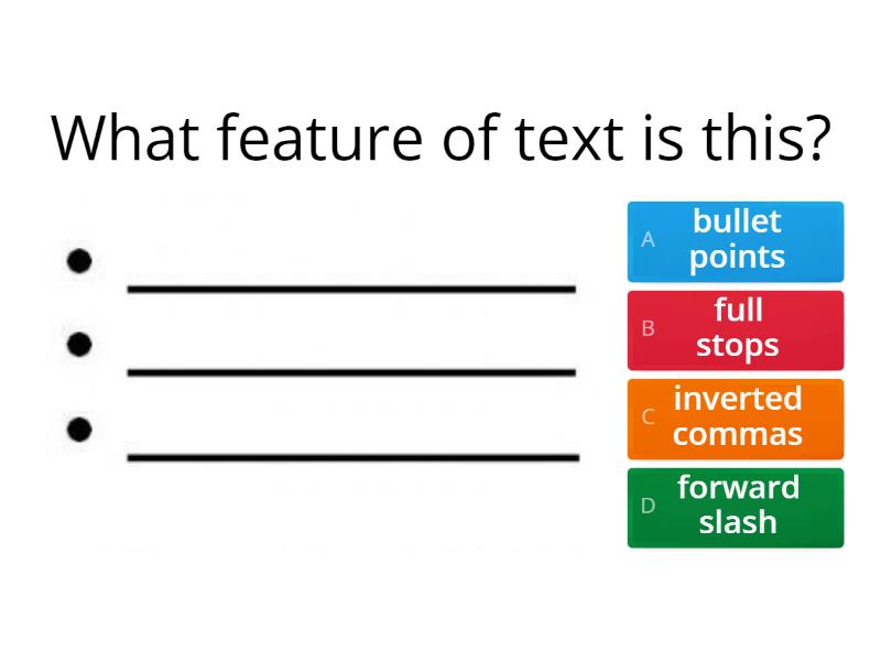 1) What feature of text is this? a) bullet points b) full stops c) inverted commas d) forward slash 2) What feature of text is this? a) bullet points b) columns c) paragraphs d) diagram 3) What feature of text is this? a) paragraphs b) lines c) columns d) row 4) What feature of text is this? a) title b) heading c) signature d) Author's name 5) What feature of text is this? a) bullet points b) forward slash c) inverted commas d) commas 6) The blue highlighted feature, what part of text is this? a) sub-heading b) line c) heading d) column 7) What feature of text is this? a) a table b) a photo c) a diagram d) heading 8) What feature of text is this? a) an illustration b) a table c) a hyperlink d) a chart 9) What feature of text is this? a) a picture b) a diagram c) a table d) a chart 10) What feature of text is this? a) an illustration b) Sub headings c) paragraphs d) Column 11) What kind of writing is this? a) an email b) a letter c) an article d) a diary entry 12) What feature of text can you see in the middle? a) sender's address b) a picture/image c) charts d) a signature 13) What feature of text is this? a) a heading b) a title c) a hyperlink d) an illustration