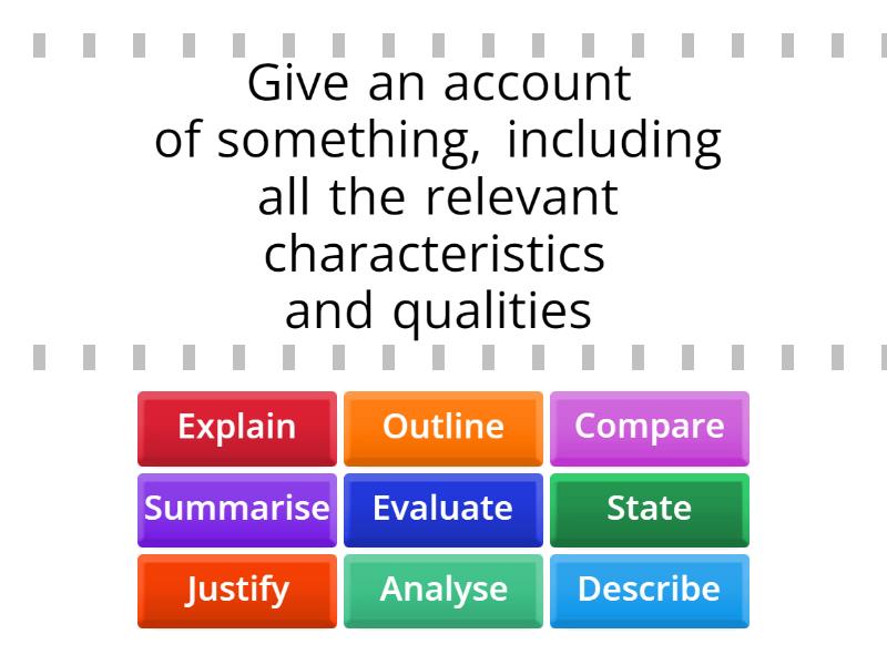 Describe - Give an account of something, including all the relevant characteristics and qualities, Explain - Give an account of the purpose or reason- how and why, Outline - Set out the main points/characteristics, State - Express the details without elaboration, Compare - To identify the similarities and/or differences between something, Evaluate - Provide a reasoned argument, giving points of view, considering pros and cons and justifying a conclusion, Analyse - Examine each part in detail breaking something down into components, Justify - Give a reasoned explanation for actions or decisions made., Summarise - Sum up and put things into your own words,