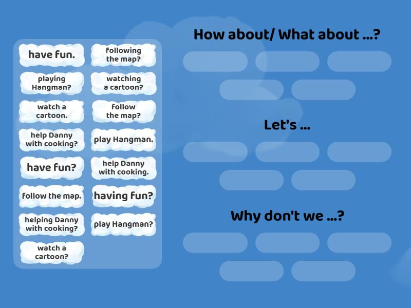 How about/ What about ...?: watching a cartoon?, following the map?, helping Danny with cooking?, playing Hangman?, having fun?, Let's ...: watch a cartoon., follow the map., help Danny with cooking., play Hangman., have fun., Why don't we ...?: watch a cartoon?, follow the map?, help Danny with cooking?, play Hangman?, have fun?,