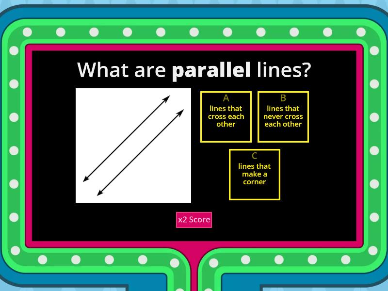 1) What are parallel lines? a) lines that cross each other b) lines that never cross each other c) lines that make a corner 2) Are these lines parallel? a) yes b) no c) maybe 3) Are these lines parallel? a) yes b) no c) maybe 4) Are these lines parallel? a) yes b) no c) maybe 5) Are these lines parallel? a) yes b) no c) maybe 6) Are these lines parallel? a) yes b) no c) maybe 7) Are these lines parallel? a) yes b) no c) maybe 8) What is a pair? a) just one b) a group of 2 c) a group of 3 d) a group of 4 9) How many pairs of parallel lines are here? a) 1 b) 2 c) 3 d) 4 10) How many pairs of parellel lines are here? a) 1 b) 2 c) 3 d) 4 11) How many pairs of parallel lines are in this shape? a) 0 b) 1 c) 2 d) 4 12) How many pairs of parallel lines are in this shape? a) 1 b) 2 c) 3 d) 4 13) How many pairs of parallel lines are in this shape? a) 0 b) 1 c) 2 d) 3 14) How many pairs of parallel lines are in this shape? a) 0 b) 1 c) 2 d) 3 15) How many pairs of parallel lines are in this shape? a) 0 b) 1 c) 2 d) 4 16) How many pairs of parallel lines are in this shape? a) 0 b) 1 c) 2 d) 5 17) How many pairs of parallel lines are in this shape? a) 2 b) 4 c) 6 d) 8 18) What makes a parallelogram? a) just 4 sides b) 4 sides + opposite parallel sides c) just opposite parallel sides 19) Which of these shapes is a parallelogram? a) b) c) d) 20) Is a square a parallelogram? a) yes b) no 21) Is a rectangle a parallelogram? a) yes b) no 22) Is a rhombus a parallelogram? a) yes b) no 23) Is a trapezoid a parallelogram? a) yes b) no 24) Is a pentagon a parallelogram? a) yes b) no 25) Is a hexagon a parallelogram? a) yes b) no