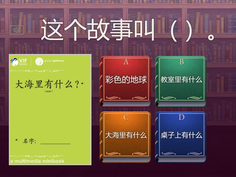 1) 这个故事叫( )。 a) 彩色的地球 b) 教室里有什么 c) 大海里有什么 d) 桌子上有什么 2) 下面哪个句子是对的? a) 海大里小鱼有。 b) 大海里有小鱼。 c) 有小鱼海里大。 d) 里大海小鱼有。 3) ( )是一个动物。 a) 大海 b) 有 c) 什么 d) 小虾 4) 大海里有( )。 a) 海龟 b) 大海 c) 小鱼 d) 小猫