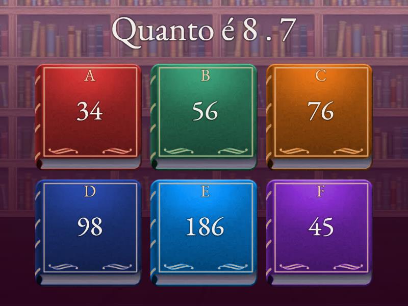 1) Quanto é 8 . 7 a) 34 b) 56 c) 76 d) 98 e) 186 f) 45 2) Quanto é 200 : 56 a) 3 b) 68 c) 5 d) 2 e) 6 f) 1 3) quanto é 525 × 5 a) 3565 b) 2625 c) 5367 d) 2652 e) 2579 f) 6252 4) Quanto é 1632 - 986 a) 63 b) 646 c) 378 d) 568 e) 349 f) 577 5) 999+456 a) 1234 b) 2141 c) 1313 d) 1455 e) 2134 f) 1232 6) quanto é 3000 ÷ 10 a) 301 b) 573 c) 300 d) 246 e) 743 f) 452 7) 400 ÷ 88 a) 3 b) 4 c) 2 d) 6 e) 5 f) 10 8) 80:6 a) 14 b) 13 c) 37 d) 63 e) 96 f) 68 9) 156+1234 a) 1213 b) 1324 c) 421 d) 1323 e) 1390 f) 3122 10) Quanto é 80682 + 478 a) 94221 b) 82573 c) 44990 d) 81160 e) 66778 f) 90572 11) 40 × 1653 a) 86021 b) 13133 c) 84576 d) 85000 e) 13446 f) 86020 12) quanto é 66×4 a) 254 b) 266 c) 264 d) 235 e) 265 f) 245 13) 2 + 5 - 4 ÷6 = ? a) 6 b) 3 c) 7 d) 1 e) 4 f) 8 14) quanto é 545-270 a) 275 b) 245 c) 321 d) 243 e) 432 f) 231 15) 12 × 5 a) 67 b) 56 c) 60 d) 46 e) 54 f) 87