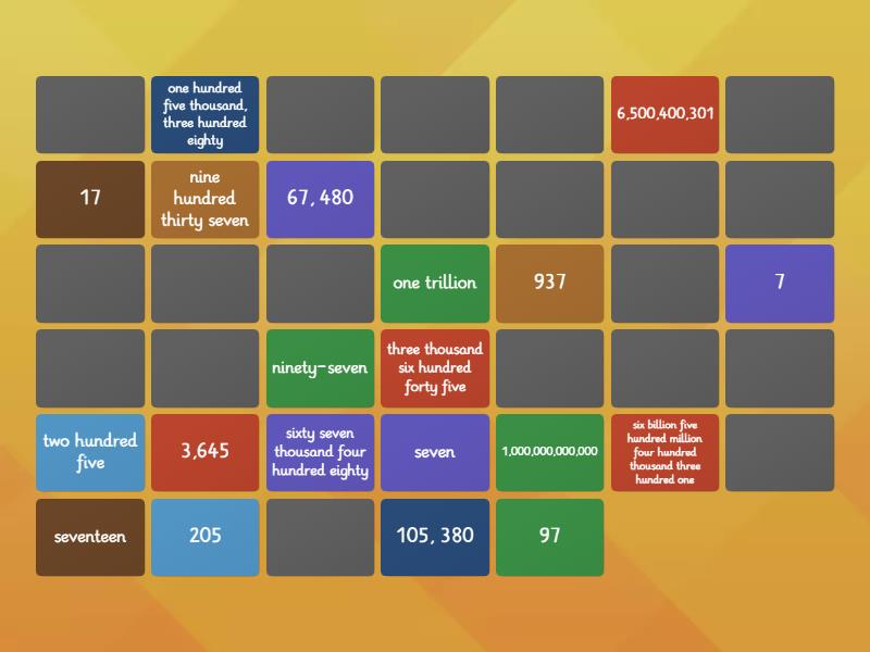 97 - ninety-seven, 67, 480 - sixty seven thousand four hundred eighty, 3,645 - three thousand six hundred forty five, 205 - two hundred five, 17 - seventeen, 105, 380 - one hundred five thousand, three hundred eighty, 937 - nine hundred thirty seven, 1,000,000,000,000 - one trillion, 7 - seven, 6,500,400,301 - six billion five hundred million four hundred thousand three hundred one, 6,245,844 - six million two hundred forty five thousand eight hundred forty four, 900,200 - nine hundred thousand two hundred, 42,010 - forty two thousand ten, 555 - five hundred fifty five, 33 - thirty three, 0 - zero, 5 - five, 6,111 - six thousand one hundred eleven, 2,000,000,000 - two billion, 1,306,789 - one million three hundred six thousand seven hundred eighty nine,