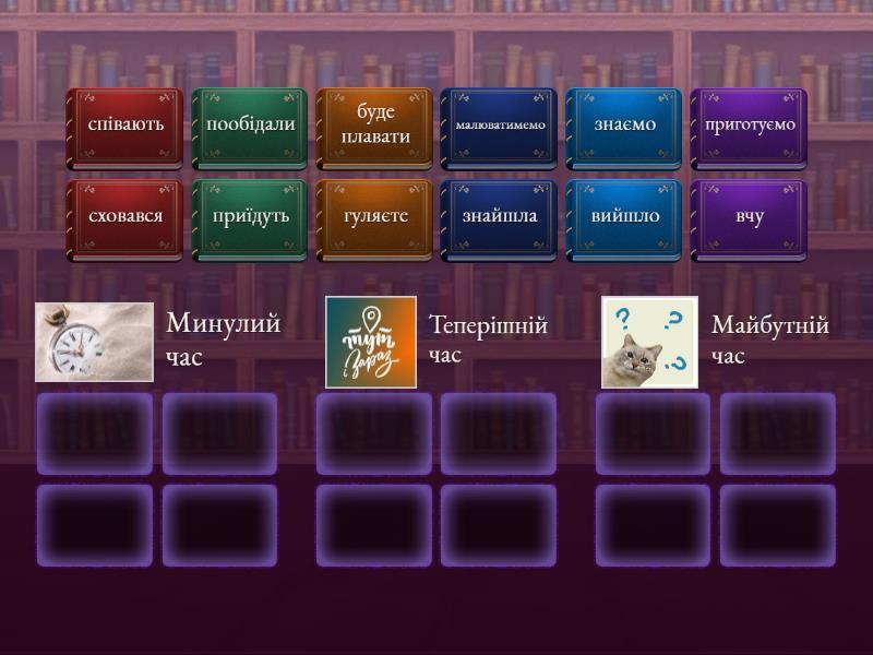 Минулий час: пообідали, знайшла, вийшло, сховався, Теперішній час: вчу, знаємо, гуляєте, співають, Майбутній час: приїдуть, буде плавати, приготуємо, малюватимемо,