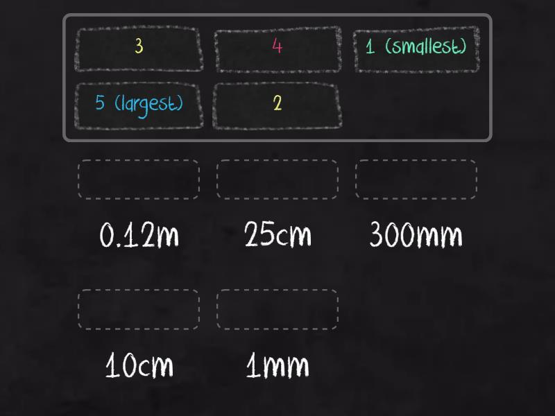 1 (smallest) - 1mm, 2 - 10cm, 3 - 0.12m, 4 - 25cm, 5 (largest) - 300mm,