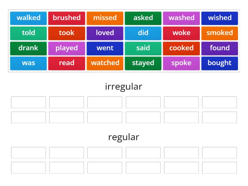 irregular : was  , drank , found , went , said , read , spoke , told , woke , took , bought , did , regular : washed  , watched , loved , played , brushed , walked , cooked , wished , stayed , smoked , asked , missed ,