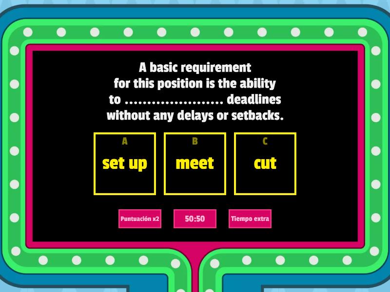 1) A basic requirement for this position is the ability to ...................... deadlines without any delays or setbacks. a) set up b) meet c) cut 2) Social gatherings are essential to ............... relationships between coworkers. a) meet b) set up c) build up 3) Considering the small amount of revenue we're getting from Facebook Ads, I think we'll have to ......... costs in the marketing area.. a) cut b) meet c) set up 4) Praising someone's excellent performance is a good way to build up .............................. a) stamina b) confidence c) business 5) Considering we're a language school and not a translators' agency, I'm afraid we don't ............ your needs. a) cut b) set up c) meet 6) To set up a new business means .... a) to formally establish a new company b) to firmly decide to start a company c) to organize a group of people and discuss a business 7) As new competitors appear, we really need to revise our service and ......................... prices if necessary. a) discount b) reduce c) pay