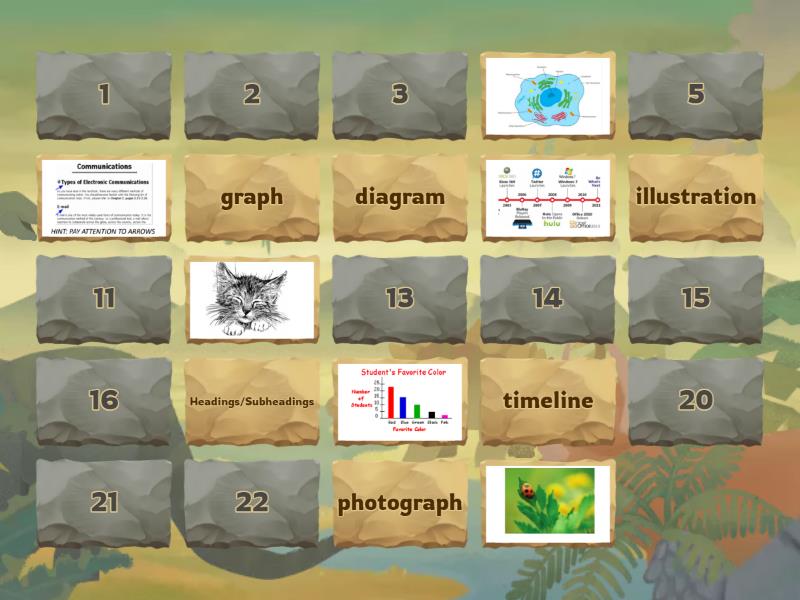 diagram, timeline, Headings/Subheadings, graph, photograph, illustration, caption, glossary, table, table of contents, map, index,
