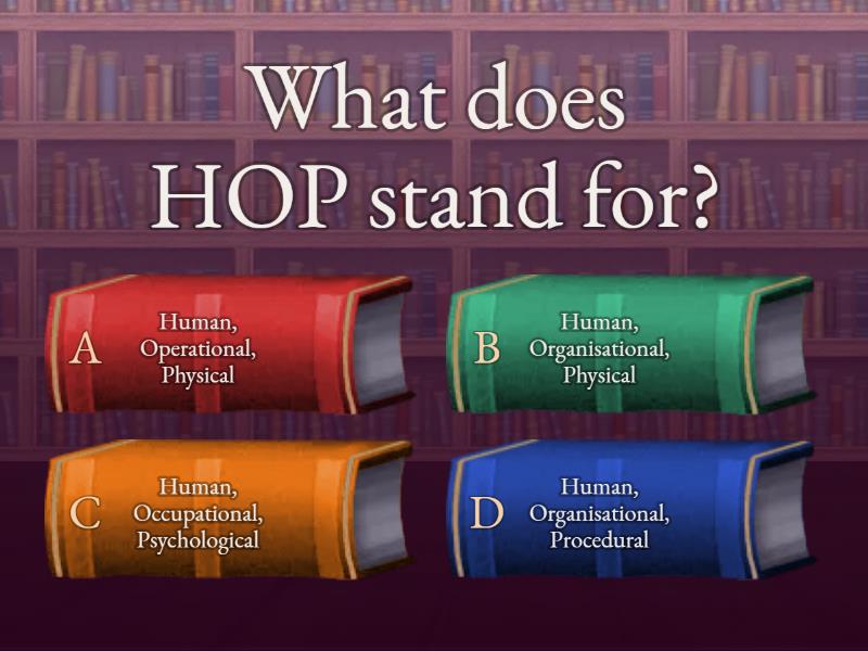1) What does HOP stand for? a) Human, Operational, Physical b) Human, Organisational, Physical c) Human, Occupational, Psychological d) Human, Organisational, Procedural 2) What is the purpose of HOP analysis? a) To identify and address human error in complex systems b) To increase efficiency in organisational processes c) To improve physical safety in the workplace d) To evaluate the impact of technology on human performance 3) Which of the following is NOT an example of a human factor in HOP analysis? a) Training and competency b) Communication and teamwork c) Equipment design and maintenance d) Fatigue and stress 4) What is a key benefit of conducting a HOP analysis? a) It increases employee motivation and job satisfaction b) It reduces the need for continuous training and development c) It identifies the root causes of errors and accidents d) It eliminates the need for ongoing safety inspections and audits 5) What is the purpose of Fishbone analysis? a) To develop a plan of action for resolving a problem b) To prioritize solutions based on their impact and feasibility c) To monitor and evaluate the effectiveness of a solution over time d) To identify all possible causes of a problem or effect 6) Which of the following is NOT a category commonly used in Fishbone analysis? a) People b) Process c) Purpose d) Product 7) What is the benefit of using Fishbone analysis? a) It encourages collaboration and communication among team members b) It provides a quick and easy solution to complex problems c) It eliminates the need for statistical analysis and data collection d) It guarantees a successful outcome for any problem or challenge