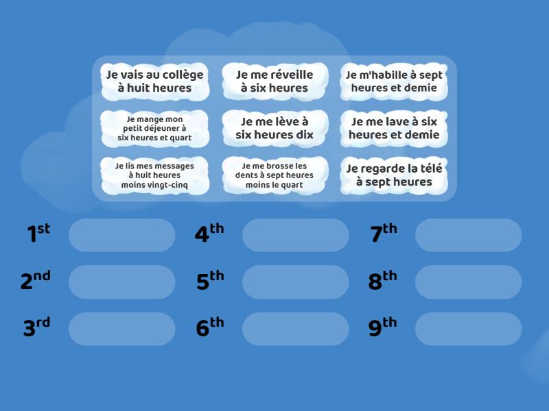 Je me réveille à six heures, Je me lève à six heures dix, Je mange mon petit déjeuner à six heures et quart, Je me lave à six heures et demie, Je me brosse les dents à sept heures moins le quart, Je regarde la télé à sept heures, Je m'habille à sept heures et demie, Je lis mes messages à huit heures moins vingt-cinq, Je vais au collège à huit heures.