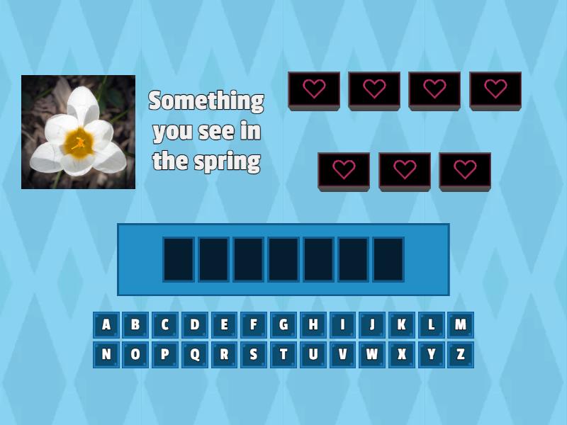 Flowers - Something you see in the spring, Grass - This is green and you see it on the ground, Rain - This is weather that is wet, Picnic - This is lunch in a park, Rainbow - This is something you see after the rain, Tree - This is something green and tall, Water - This is something you pour on seeds to help them grow, Raincoat - This is something you wear in the rain, Easter - This is a holiday in April with eggs, Easter - This is a holiday in April with eggs, Bird - An animal that flies in the sky, Umbrella - Something I use in the rain, Kite - Something I play with in the wind, butterfly - This is a bug that started as a caterpillar, bees - This is an insect that can sting you, season - This is what spring is, bunny - This is an animal you see for Easter,