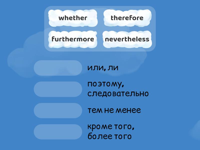 furthermore - кроме того, более того, nevertheless - тем не менее, therefore - поэтому, следовательно, whether - или, ли,