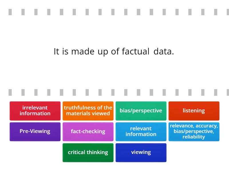 relevant information - It is made up of factual data., irrelevant information - It is any additional information that is unrelated to the topic at hand and hence unimportant., truthfulness of the materials viewed - It refers to the correctness of the content as well as the major concept that the material provides to the viewers, which brings the truth based on what has happened in the past and what is occurring now., critical thinking - It is a vital skill that helps to select accurate information., fact-checking - It should always be done to save time looking for basic sources and research on which an article was based., viewing - It is described as the active process of attending to and interpreting visual material such as television, advertisements, films, diagrams, symbols, pictures, videos, theatre, drawings, sculptures, and paintings., bias/perspective - It is one of the factors when determining the relevance and truthfulness of ideas. It is the slant position in which an author interprets information. , listening - It is one of the five macro-skills., Pre-Viewing - It is one of the steps in viewing that the effective and active viewers should engage, relevance, accuracy, bias/perspective, reliability - The factors when determining the relevance and truthfulness of ideas.,