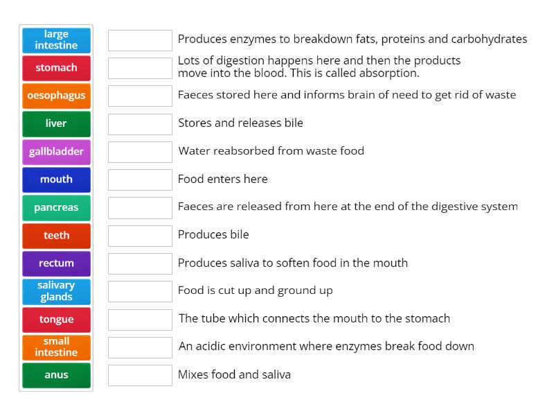 mouth - Food enters here, teeth - Food is cut up and ground up, tongue - Mixes food and saliva, oesophagus - The tube which connects the mouth to the stomach, liver - Produces bile, salivary glands - Produces saliva to soften food in the mouth, gallbladder - Stores and releases bile, stomach - An acidic environment where enzymes break food down, large intestine - Water reabsorbed from waste food, pancreas - Produces enzymes to breakdown fats, proteins and carbohydrates, rectum - Faeces stored here and informs brain of need to get rid of waste, anus - Faeces are released from here at the end of the digestive system, small intestine - Lots of digestion happens here and then the products move into the blood. This is called absorption. ,