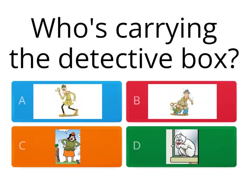 1) Who are the detectives looking for? a) b) c) d) 2) Who answers the telephone? a) b) c) d) 3) Who's got blue trousers? a) b) c) d) 4) Who hasn't got a tail?? a) b) c) d) 5) Who has an accident? a) b) c) d) 6) Who's got white fur and blue eyes? a) b) c) d) 7) Who's wearing a green hat? a) b) c) d) 8) Who's carrying the detective box? a) b) c) d)
