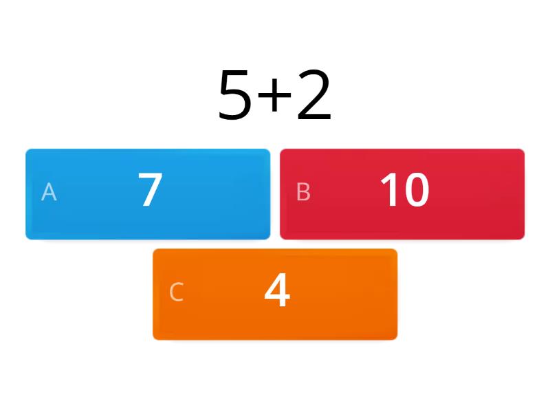 1) 5+2 a) 7 b) 10 c) 4 2) 2+7 a) 4 b) 14 c) 9 3) 6+2 a) 12 b) 8 c) 4 4) 2+5 a) 4 b) 7 c) 10 5) 7+2 a) 5 b) 14 c) 9 6) 2+6 a) 4 b) 8 c) 12