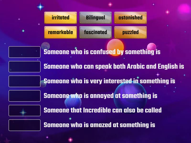 remarkable - Someone who can speak both Arabic and English is, astonished - Someone who is amazed at something is, Bilingual - Someone that Incredible can also be called, puzzled - Someone who is confused by something is, irritated - Someone who is annoyed at something is, fascinated - Someone who is very interested in something is,