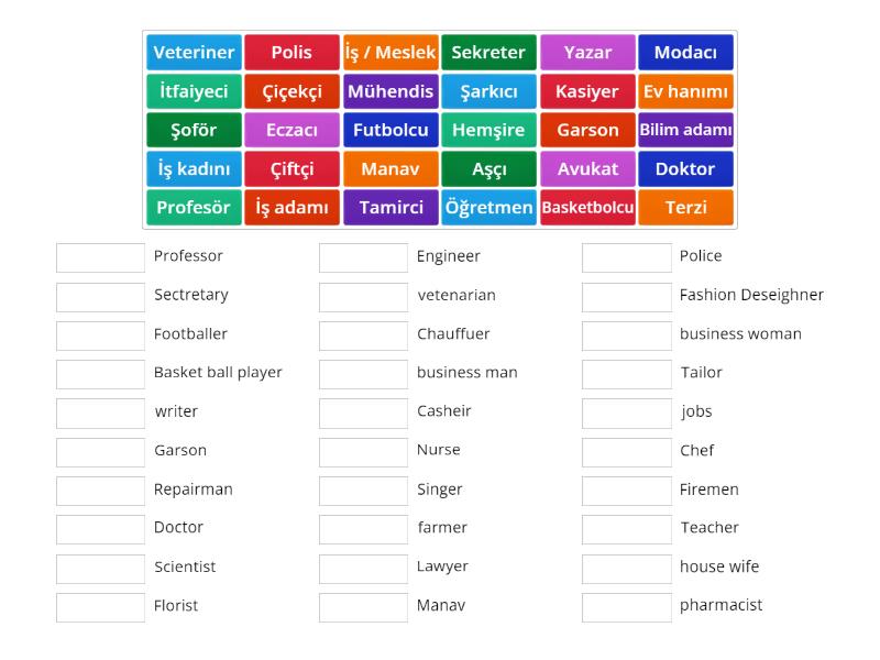 İş / Meslek - jobs, Profesör - Professor, Terzi - Tailor, Avukat - Lawyer, Hemşire - Nurse, Polis - Police, Sekreter - Sectretary, Öğretmen - Teacher, Şoför - Chauffuer, Tamirci - Repairman, Doktor - Doctor, Futbolcu - Footballer, Basketbolcu - Basket ball player , Şarkıcı - Singer, Garson - Garson, Mühendis - Engineer, İş adamı - business man, İş kadını - business woman, Aşçı - Chef, İtfaiyeci - Firemen, Veteriner - vetenarian, Çiftçi - farmer, Kasiyer - Casheir, Manav - Manav, Eczacı - pharmacist, Modacı - Fashion Deseighner, Ev hanımı - house wife, Bilim adamı - Scientist, Çiçekçi - Florist, Yazar - writer,