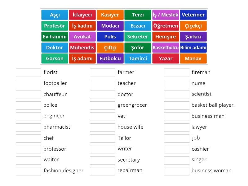 İş / Meslek - job, Profesör - professor, Terzi - Tailor, Avukat - lawyer, Hemşire - nurse, Polis - police, Sekreter - secretary, Öğretmen - teacher, Şoför - chauffeur, Tamirci - repairman, Doktor - doctor, Futbolcu - footballer, Basketbolcu - basket ball player, Şarkıcı - singer, Garson - waiter, Mühendis - engineer, İş adamı - business man, İş kadını - business woman, Aşçı - chef, İtfaiyeci - fireman, Veteriner - vet, Çiftçi - farmer, Kasiyer - cashier, Manav - greengrocer, Eczacı - pharmacist, Modacı - fashion designer, Ev hanımı - house wife, Bilim adamı - scientist, Çiçekçi - florist, Yazar - writer,