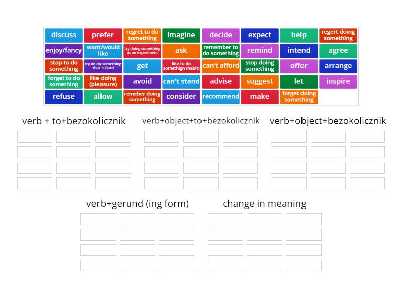 verb + to+bezokolicznik: agree, arrange, can't afford, decide, offer, refuse, want/would like, intend, prefer, verb+object+to+bezokolicznik: advise, allow, expect, remind, help, inspire, get, ask, verb+object+bezokolicznik: let, make, verb+gerund (ing form): avoid, can't stand, enjoy/fancy, consider, discuss, imagine, recommend, suggest, change in meaning: like doing (pleasure), remember to do something, remeber doing something, forget to do something, forget doing something, stop to do something, stop doing something, regret to do something, regert doing something, try do do something that is hard, try doing something as an experiment, like to do somethign (habit),