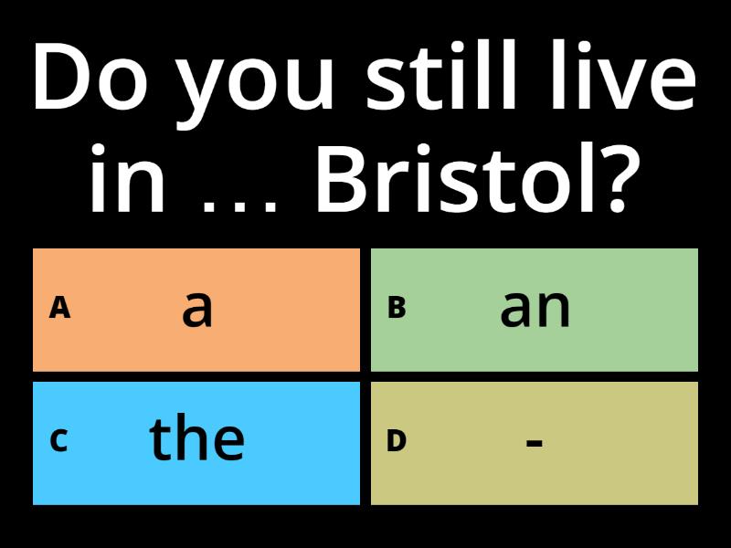 1) Do you still live in … Bristol? a) a b) an c) the d) - 2) Carol's father works as … electrician. a) a b) an c) the d) - 3) My grandmother likes .. flowers very much. a) a b) an c) the d) - 4) I always listen to the radio in … morning. a) a b) an c) the d) - 5) There is … new English book on the desk. a) a b) an c) the d) - 6) Loch Ness is … most famous lake in Scotland. a) a b) an c) the d) - 7) Peter has … aunt in Berlin. a) a b) an c) the d) - 8) Look! There's … bird flying. a) a b) an c) the d) - 9) Last year I gave my mother ... bracelet for her birthday. a) a b) an c) the d) - 10) What is … name of this village? a) a b) an c) the d) - 11) Montreal is a large city in … Canada. a) a b) an c) the d) - 12) When I went to Milan, I stayed with … Italian friend of mine. a) a b) an c) the d) - 13) Tom is in … bathroom. He's having a bath. a) a b) an c) the d) - 14) Enjoy your holiday and don't forget to send me … postcard! a) a b) an c) the d) - 15) Our friends … Smiths moved to New Jersey last August. a) a b) an c) the d) - 16) Our children go to … school by bus. a) a b) an c) the d) - 17) … roses are my favorite flowers. a) a b) an c) the d) - 18) … apple a day keeps the doctor away. a) a b) an c) the d) - 19) Would you like … cup of tea? a) a b) an c) the d) - 20) He is … best student in his college. a) a b) an c) the d) -