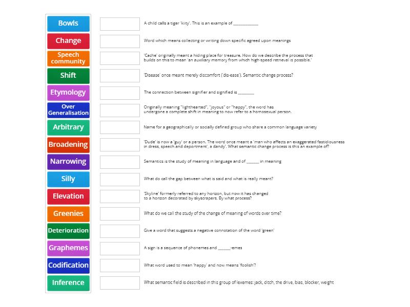 Change - Semantics is the study of meaning in language and of _______ in meaning, Speech community - Name for a geographically or socially defined group who share a common language variety, Graphemes - A sign is a sequence of phonemes and _______-emes, Arbitrary - The connection between signifier and signified is _________, Bowls - What semantic field is described in this group of lexemes: jack, ditch, the drive, bias, blocker, weight , Inference - What do call the gap between what is said and what is really meant?, Over Generalisation - A child calls a tiger 'kiity'. This is an example of ______________, Etymology - What do we call the study of the change of meaning of words over time?, Silly - What word used to mean 'happy' and now means 'foolish'?, Codification - Word which means collecting or writing down specific agreed upon meanings, Greenies - Give a word that suggests a negative connotation of the word 'green', Broadening - 'Cache' originally meant a hiding place for treasure. How do we describe the process that builds on this to mean 'an auxiliary memory from which high-speed retrieval is possible.', Narrowing - 'Skyline' formerly referred to any horizon, but now it has changed to a horizon decorated by skyscrapers. By what process?, Elevation - 'Dude' is now a 'guy' or a person. The word once meant a 'man who affects an exaggerated fastidiousness in dress, speech and deportment', a dandy'. What semantic change process is this an example of?, Deterioration - 'Disease' once meant merely discomfort ('dis-ease'). Semantic change process?, Shift - Originally meaning "lighthearted", "joyous" or "happy", the word has undergone a complete shift in meaning to now refer to a homosexual person.,