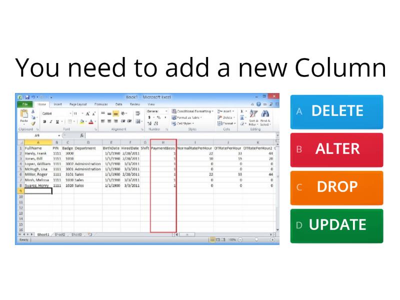 1) You need to add a new Column a) DELETE b) ALTER c) DROP d) UPDATE 2) You need to remove a record from the Database a) Drop b) Remove c) Update d) Delete 3) You need to remove an entire table from the Database a) Delete b) Alter c) Drop d) Remove 4) What is this a) Field b) Column c) Row d) Record 5) You need to add a employee into the database a) ADD b) INSERT c) UPDATE d) MOVE 6) Which is the Foreign and Primary Key a) Blue- Foreign, Pink-Primary b) Blue-Primary, Pink Foreign 7) What is this a) Foreign Key b) Row c) Primary Key d) Column 8) What is this a) Field b) Record/Row c) Column d) Table 9) An employee changed their last name a) MODIFY b) CHANGE c) UPDATE d) INSERT 10) You need to add a new table with foreign keys to relate back to the primary table a) ALTER b) ADD c) CREATE d) INSERT