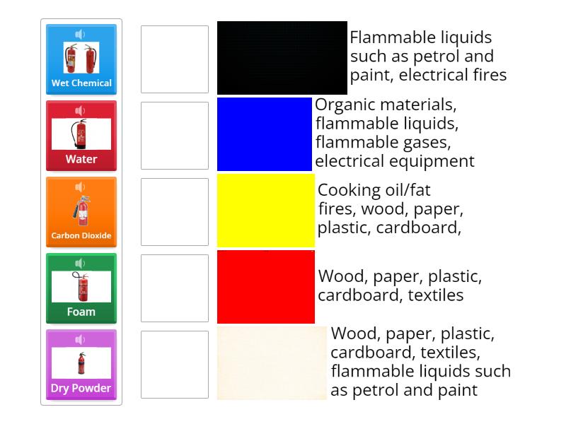 Water - Wood, paper, plastic, cardboard, textiles, Carbon Dioxide - Flammable liquids such as petrol and paint, electrical fires, Foam - Wood, paper, plastic, cardboard, textiles, flammable liquids such as petrol and paint, Dry Powder - Organic materials, flammable liquids, flammable gases, electrical equipment, Wet Chemical - Cooking oil/fat fires, wood, paper, plastic, cardboard,,