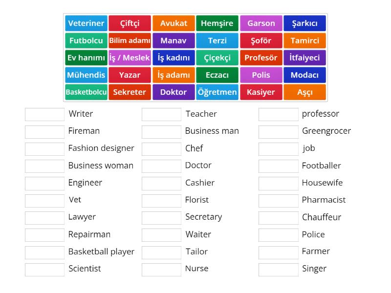İş / Meslek - job, Profesör - professor, Terzi - Tailor, Avukat - Lawyer, Hemşire - Nurse, Polis - Police, Sekreter - Secretary, Öğretmen - Teacher, Şoför - Chauffeur, Tamirci - Repairman, Doktor - Doctor, Futbolcu - Footballer, Basketbolcu - Basketball player, Şarkıcı - Singer, Garson - Waiter, Mühendis - Engineer, İş adamı - Business man, İş kadını - Business woman, Aşçı - Chef, İtfaiyeci - Fireman, Veteriner - Vet, Çiftçi - Farmer, Kasiyer - Cashier, Manav - Greengrocer, Eczacı - Pharmacist, Modacı - Fashion designer, Ev hanımı - Housewife, Bilim adamı - Scientist, Çiçekçi - Florist, Yazar - Writer,