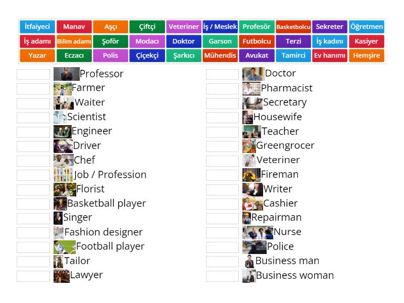 İş / Meslek - Job / Profession, Profesör - Professor, Terzi - Tailor, Avukat - Lawyer, Hemşire - Nurse, Polis - Police, Sekreter - Secretary, Öğretmen - Teacher, Şoför - Driver, Tamirci - Repairman, Doktor - Doctor, Futbolcu - Football player, Basketbolcu - Basketball player, Şarkıcı - Singer, Garson - Waiter, Mühendis - Engineer, İş adamı - Business man, İş kadını - Business woman, Aşçı - Chef, İtfaiyeci - Fireman, Veteriner - Veteriner, Çiftçi - Farmer, Kasiyer - Cashier , Manav - Greengrocer, Eczacı - Pharmacist, Modacı - Fashion designer, Ev hanımı - Housewife, Bilim adamı - Scientist, Çiçekçi - Florist, Yazar - Writer,