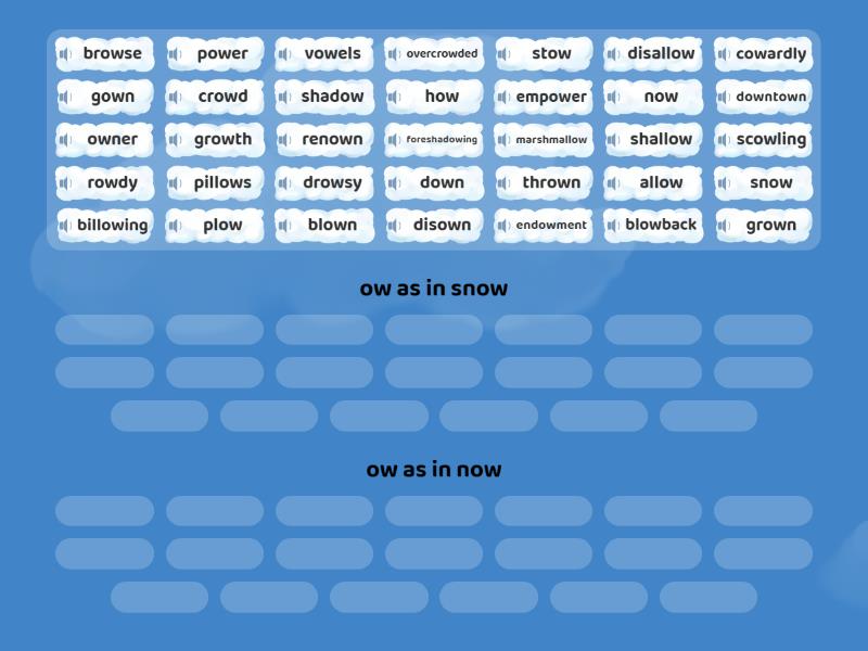 ow as in snow: snow, stow, growth, shallow, disown, owner, billowing, pillows, marshmallow, thrown, foreshadowing, shadow, blown, blowback, grown, ow as in now: overcrowded, cowardly, vowels, disallow, browse, downtown, renown, down, endowment, empower, rowdy, drowsy, crowd, allow, power, now, how, plow, gown, scowling,