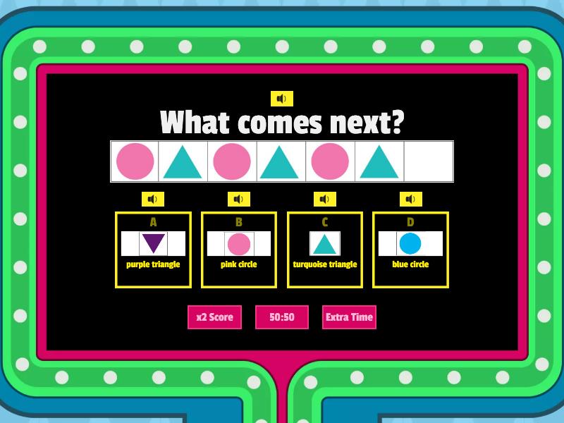 1) What comes next? a) purple triangle b) pink circle c) turquoise triangle d) blue circle 2) What comes next? a) orange triangle b) orange circle c) pink circle d) purple triangle 3) What comes next? a) turquoise triangle b) orange circle c) orange triangle d) blue circle 4) What comes next? a) red circle b) pink circle c) blue circle d) small pink circle 5) What comes next? a) mosquito b) ant c) butterfly d) bee 6) What comes next? a) mosquito b) ladybird c) ant d) bee 7) What comes next? a) bee b) ant c) mosquito d) butterfly