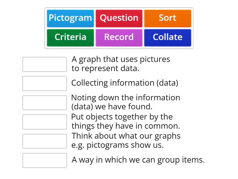 Criteria - A way in which we can group items., Sort - Put objects together by the things they have in common., Collate - Collecting information (data), Record - Noting down the information (data) we have found., Pictogram - A graph that uses pictures to represent data., Question - Think about what our graphs e.g. pictograms show us.,