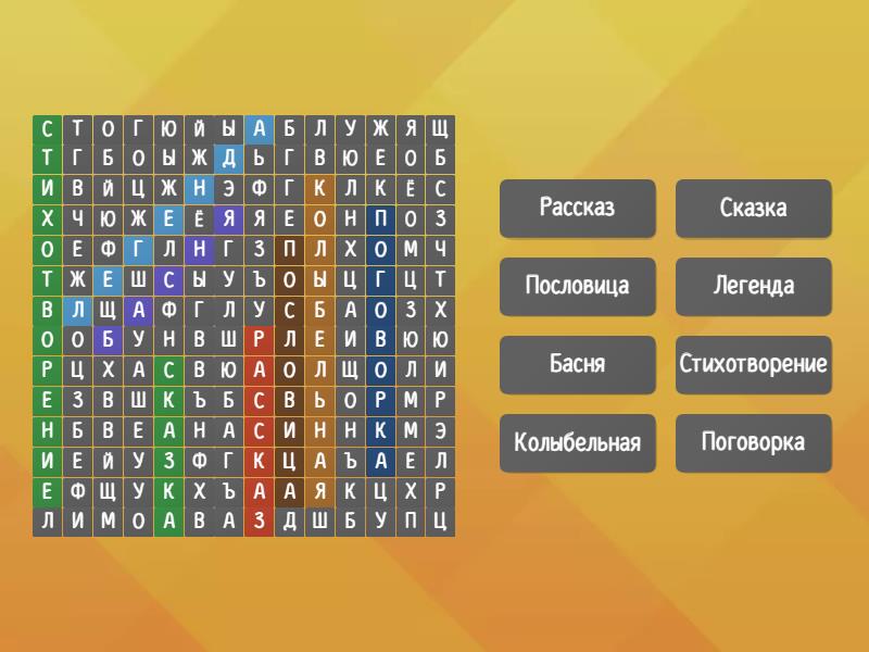 Сказка - Сказка, Басня - Басня, Рассказ - Рассказ, Легенда - Легенда, Пословица - Пословица, Поговорка - Поговорка, Колыбельная - Колыбельная, Стихотворение - Стихотворение,