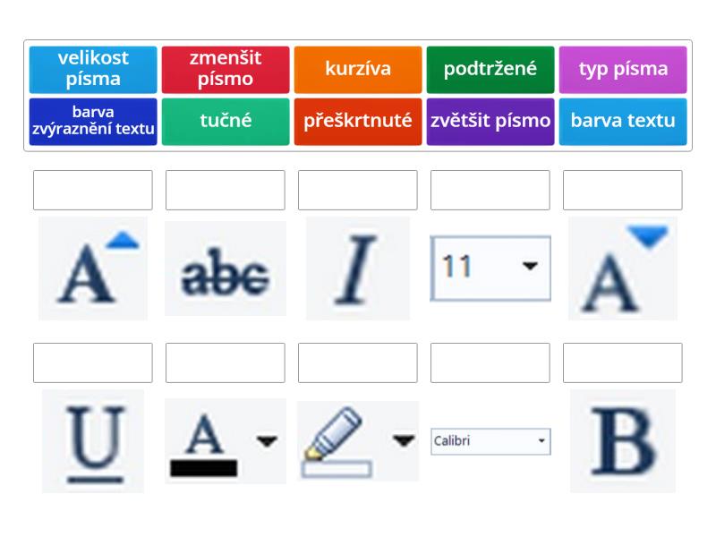 typ písma, velikost písma, zvětšit písmo, zmenšit písmo, tučné, kurzíva, podtržené, barva textu, barva zvýraznění textu, přeškrtnuté,