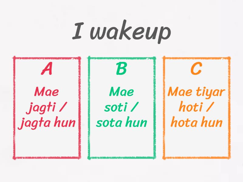 1) I wakeup a) Mae jagti / jagta hun b) Mae soti / sota hun c) Mae tiyar hoti / hota hun 2) I eat breakfast a) Mae nashta karti / karta hun b) Mae khana khati / khata hun c) Mae soti / sota hun 3) I get ready a) Mae soti / sota hun b) Mae khati / khata hun c) Mae tiyar hoti / hota hun 4) I come back a) Mae peeta / peeti hun b) Mae khati / khata hun c) Mae wapis ata / ati hun 5) I go to school a) Mae parhti / parhta hun b) Mae school jati / jata hun c) Mae khana khati / khata hun 6) I take rest a) Mae khana khati / khata hun b) Mae aram karti / karta hun c) Mae soti / sota hun 7) I play a) Mae soti / sota hun b) Mae jagti / jagta hun c) Mae khailti / khailta hun 8) I sleep early a) Mae jaldi khailti / khailta hun b) Mae jaldi khata / khati hun c) Mae jaldi soti / sota hun 9) I watch cartoon a) mae tiyar hota / hoti hun b) Mae cartoon daikhta / daikhti hun c) Mae aram karta / karti hun 10) I study a) Mae sota / soti hun b) Mae khailta / khailti hun c) Mae parhta/ parhti hun 11) I drink milk a) Mae dhood peeta/ti hun b) Mae chaey peeta/ti hun c) Mae pani peeta/ti hun