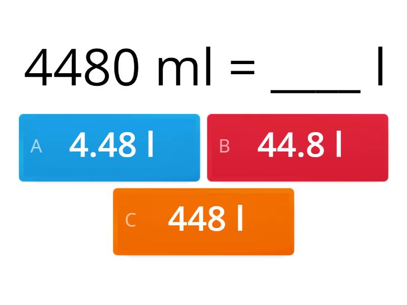 1) 4480 ml = ____ l a) 4.48 l b) 44.8 l c) 448 l 2) 5642 ml = ____ l a) 56.42 l b) 564.2 l c) 5.642 l 3) 1.654 l = ____ ml a) 165 ml b) 1654 ml c) 163 ml 4) 0.766 l = _____ ml a) 766 ml b) 76 ml c) 07.66 ml 5) 9010 ml = _____ l a) 9.01 l b) 90.1 l c) 901 l 6) 6.76 l = ______ ml a) 67 ml b) 676 ml c) 6760 ml