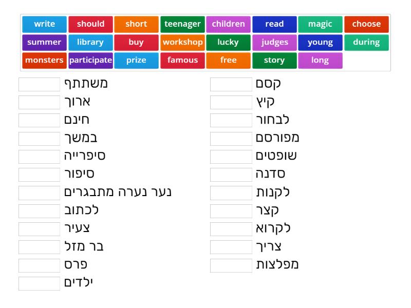 children - ילדים, write - לכתוב, teenager - נער נערה מתבגרים, participate - משתתף, prize - פרס, short - קצר, story - סיפור, monsters - מפלצות, magic - קסם, should - צריך, long - ארוך, buy - לקנות, judges - שופטים, read - לקרוא, lucky - בר מזל, workshop - סדנה, free - חינם, during - במשך, young - צעיר, library - סיפרייה, choose - לבחור, summer - קיץ, famous - מפורסם,