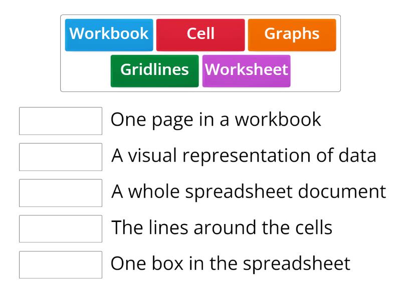 Cell - One box in the spreadsheet, Worksheet - One page in a workbook, Gridlines - The lines around the cells, Graphs - A visual representation of data, Workbook - A whole spreadsheet document,